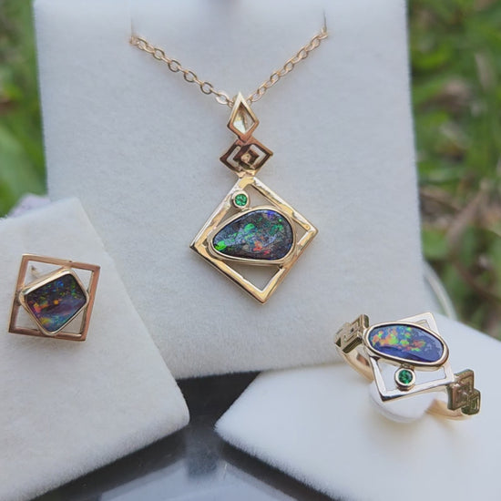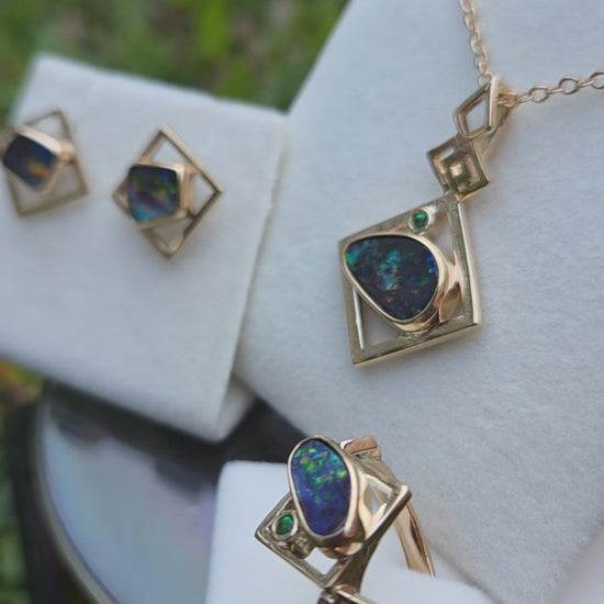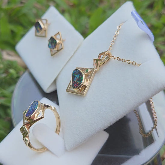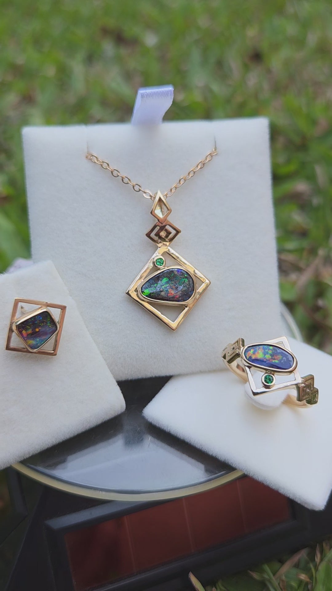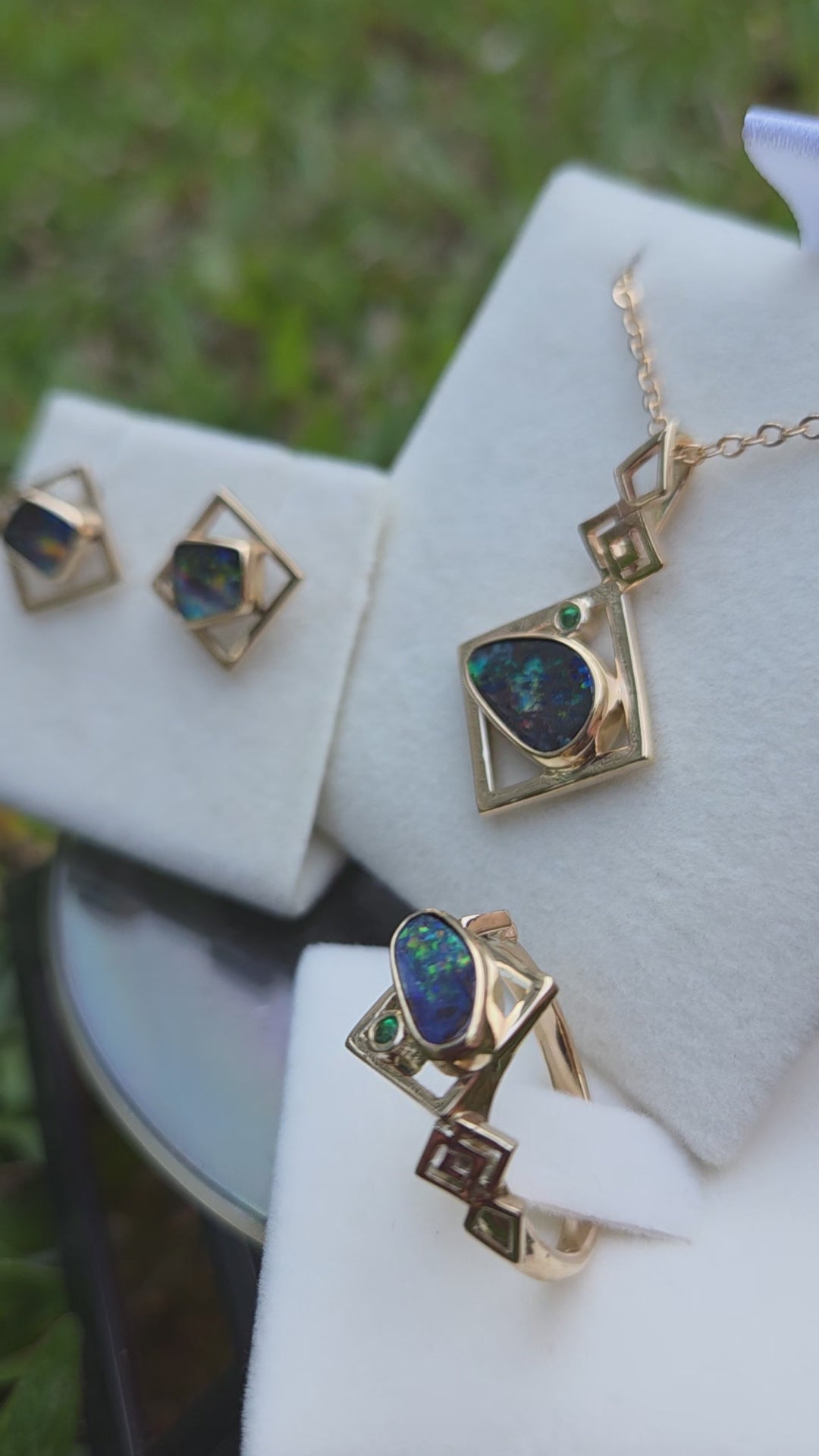 Unique Geometric design jewellery set in 9ct yellow gold featuring matching color, freeform shape, solid Queensland Boulder Opals with red flash colour play and bright, natural emerald highlights.