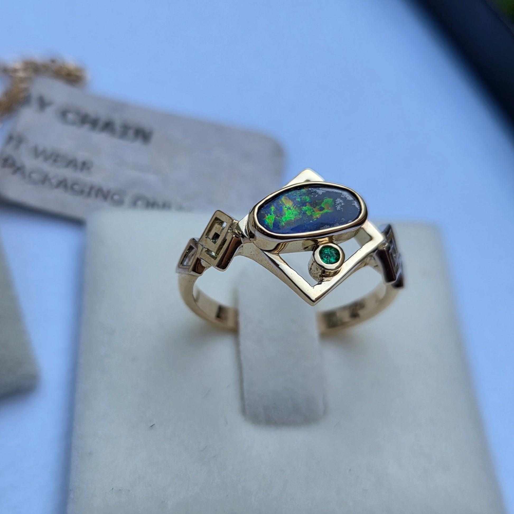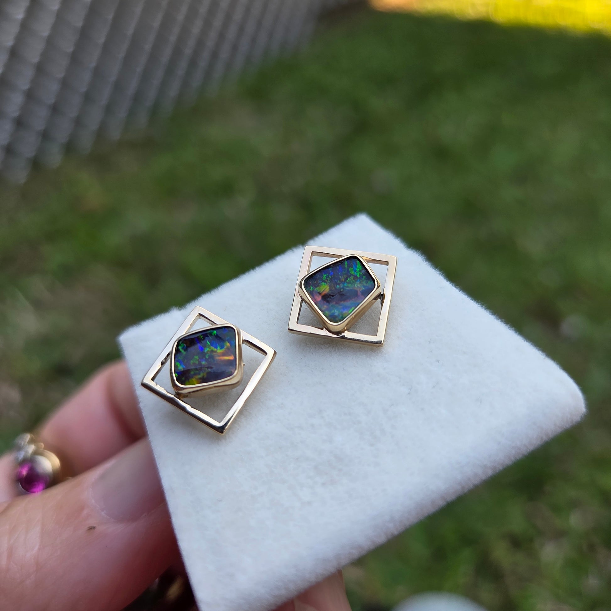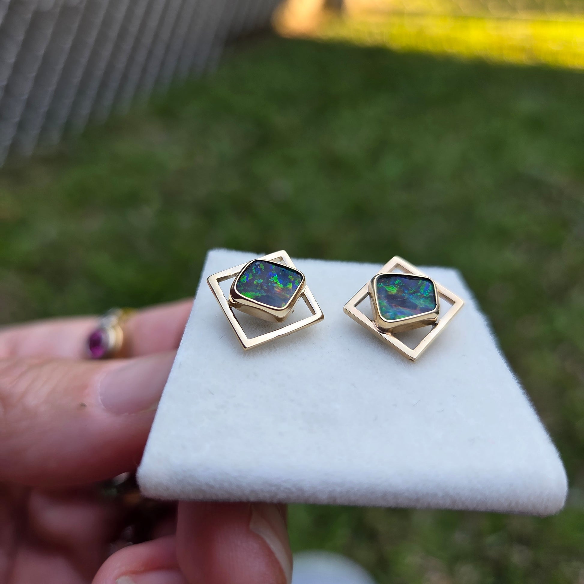 Unique Geometric design jewellery set in 9ct yellow gold featuring matching color, freeform shape, solid Queensland Boulder Opals with red flash colour play and bright, natural emerald highlights.